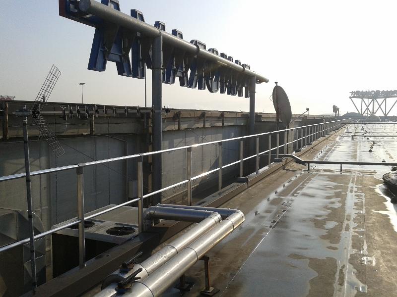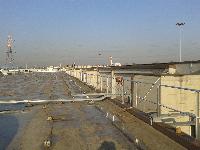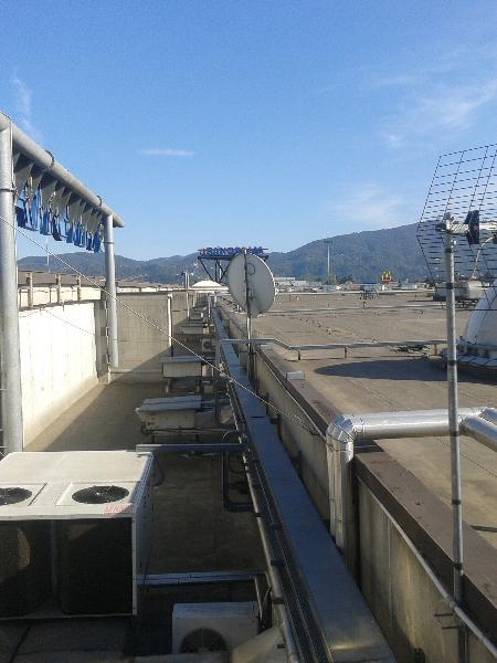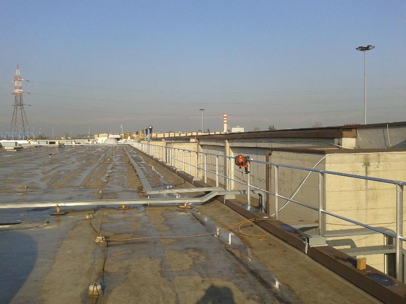 Intervento di messa in sicurezza di un'area della copertura dove sono posizionati gli impianti tecnologici ed è frequente il transito dei manutentori. Sono stati installati dei parapetti in alluminio conformi alla normativa EN 14122-3, Mod. ALLUKEMI SKY tipo SKMD2 con fissaggio a muro. Questa versione fissata alla struttura rispetta anche le norme NTC08 (carichi variabili cat. H1 - coperture e sotto tetti accessibili per la sola manutenzione).